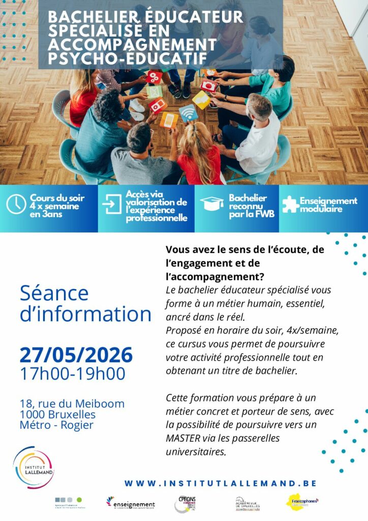 Formation orientée vers les métiers de l’accompagnement ; bachelier reconnu FWB, horaire du soir (4x/semaine).