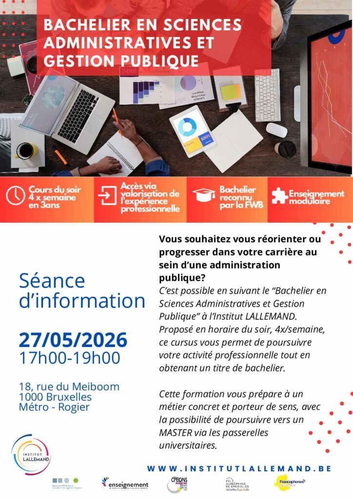 Cette séance d’information présente l’enseignement supérieur pour adultes tel qu’organisé à l’Institut Lallemand : horaires du soir, organisation modulaire (UE), évaluations, stages, accompagnement (SAR), et modalités d’admission.