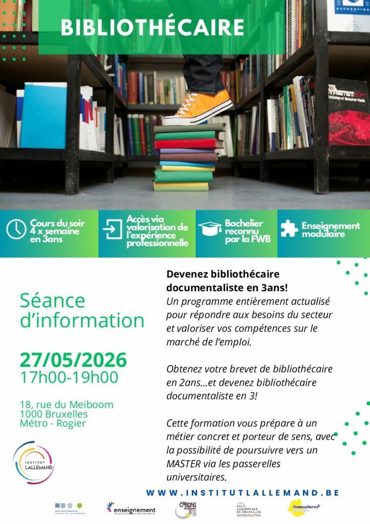 Brevet en 2 ans puis bibliothécaire‑documentaliste en 1 ans ; cursus du soir 4x/semaine, bachelier reconnu FWB.