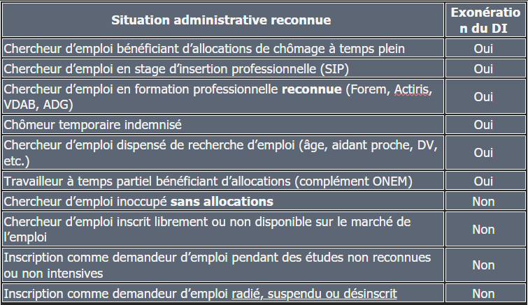 Le simple fait d’être inscrit comme demandeur d’emploi n’ouvre pas automatiquement le droit à l’exonération. Celle-ci dépend exclusivement du statut administratif reconnu par l’organisme compétent (Forem, Actiris, ADG, VDAB), tel que transmis à l’établissement. Référence : Circulaire 9593